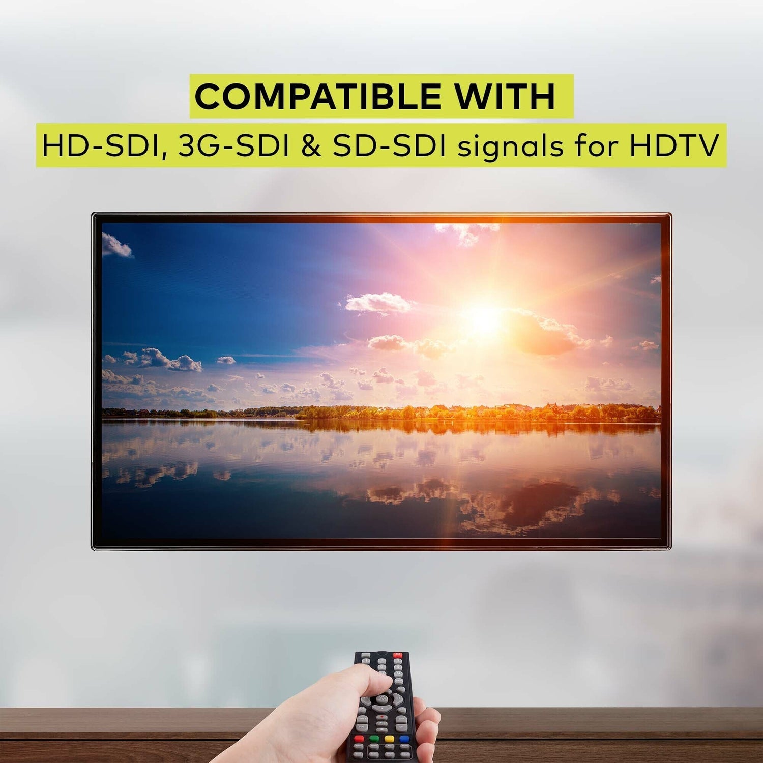 The Koah Pro Premium 3G-SDI Video Cable is an 18 AWG RG-6 coaxial cable that supports high-definition RF and video signals. The 3G SDI coax cable is thin and easy to bend for wall or ceiling installations and remains the preferred choice to relay cable television signals. Our coaxial cable features BNC male to BNC male connectors that support satellite signal transmission for residential or commercial installations. Built with OFC Braided Shielding and FPE insulation, this cable provides superior protection against signal drop-outs and RF/EMI interference. Its thicker dielectric insulation makes it less likely to carry damaging electric currents. With minimum static and high picture quality, the coax cable is an optimal choice for high-definition signals in the home and commercial entertainment systems. It supports HD-SDI, 3G-SDI, and SD-SDI signals, making it compatible with VCR, camera, CB radio, CCTV monitor, SDI converter, video splitter, and oscilloscopes. Comes with Koah 1-year limited warranty. The Koah 25-feet SDI Video Cable is a professional, 75-ohm coaxial cable that supports high-definition video signals. It features two male BNC connectors that will support RF and video signal transfers. This cable is an 18 AWG gauge cable and is FPE insulated. Built with high-density OFC braided shielding, it will reject EMI and RF interference.