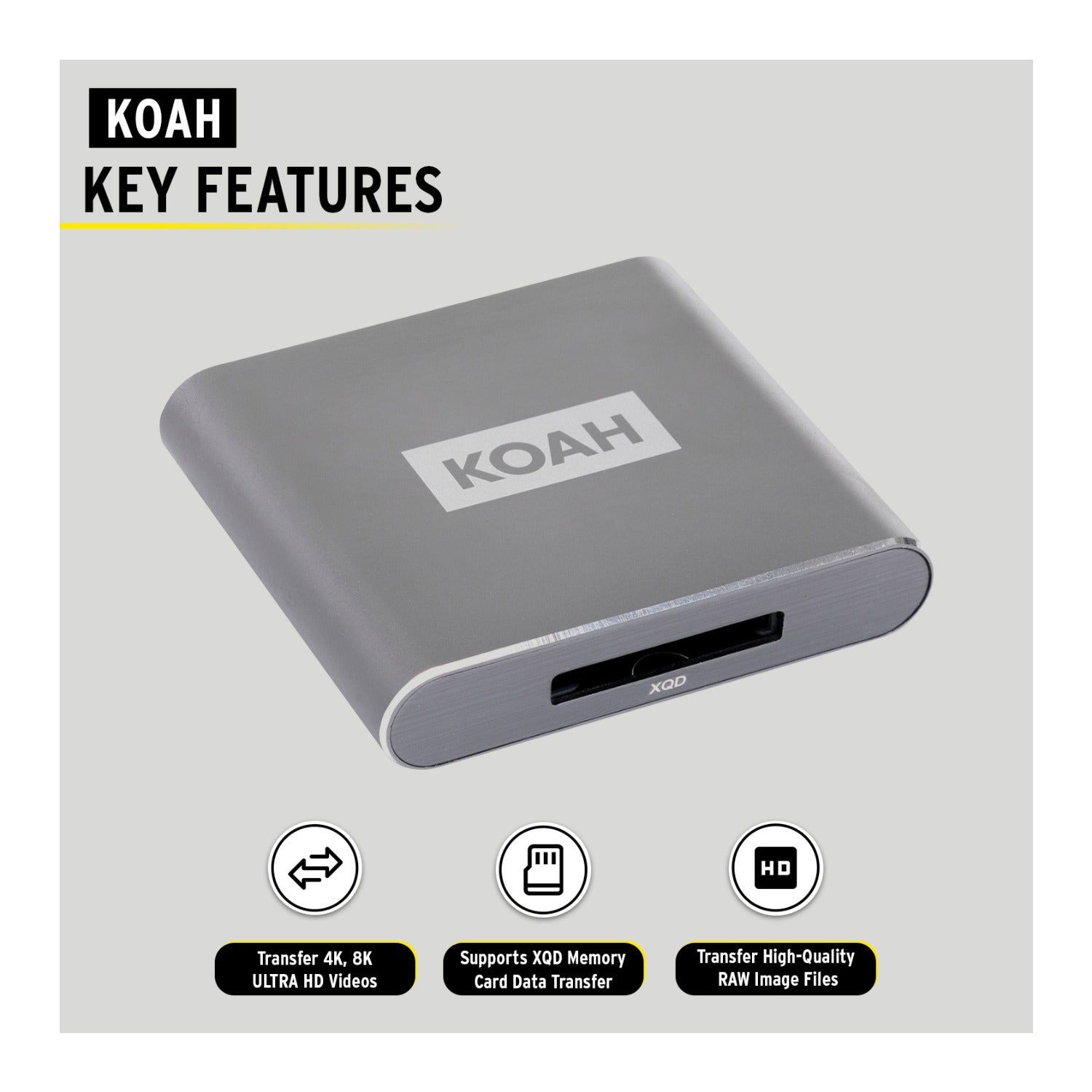 The Koah Pro Type-C XQD Reader is designed for photographers to easily transfer high-Quality RAW image files and 4K, 8K ULTRA HD videos and other large data volume files. This card reader supports XQD memory card data transfer and has the ability to read and write high-resolution photos, full HD videos from your XQD card quickly.