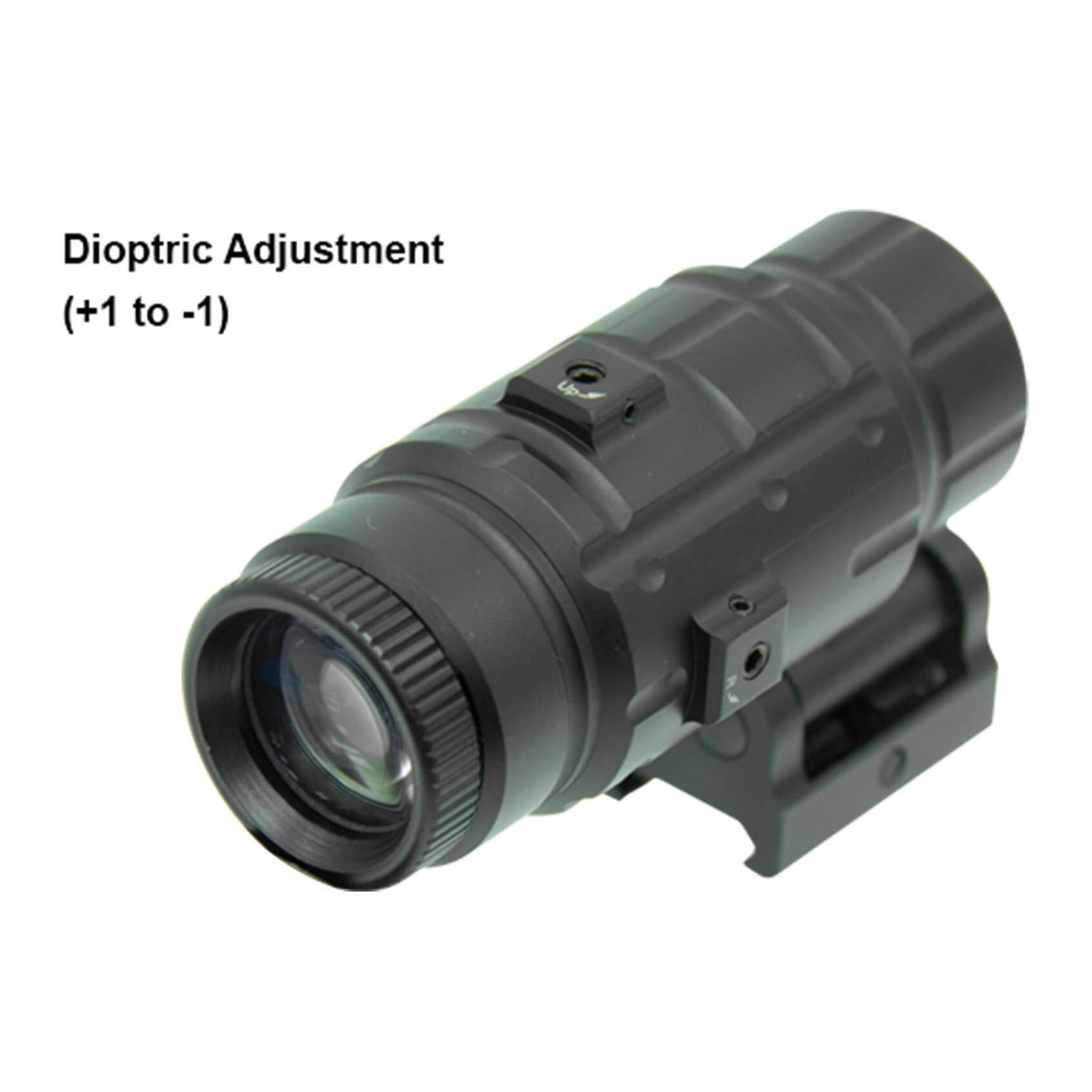 The UTG 3x Magnifier features an adjustable eyepiece for easy dioptric correction and comes with a patented quick-detach lever lock mounting base. Its precision machining and anodizing for maximum strength and wear resistance. It is completely sealed and nitrogen-filled, for fog-proof and weather-proof.