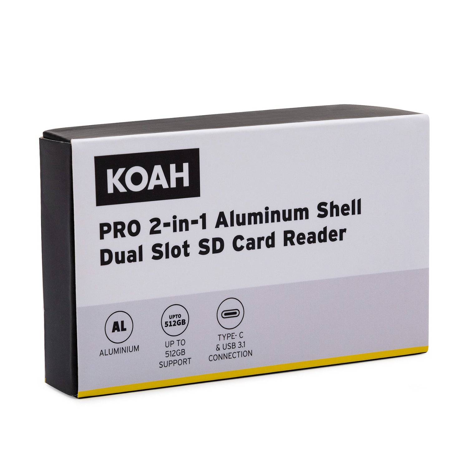 Read your memory cards easily on the go with the Koah PRO 2-in-1 Aluminum Shell On-The-Go Dual Slot SD Card Reader! Its aluminum shell is durable and gives it a sleek look.