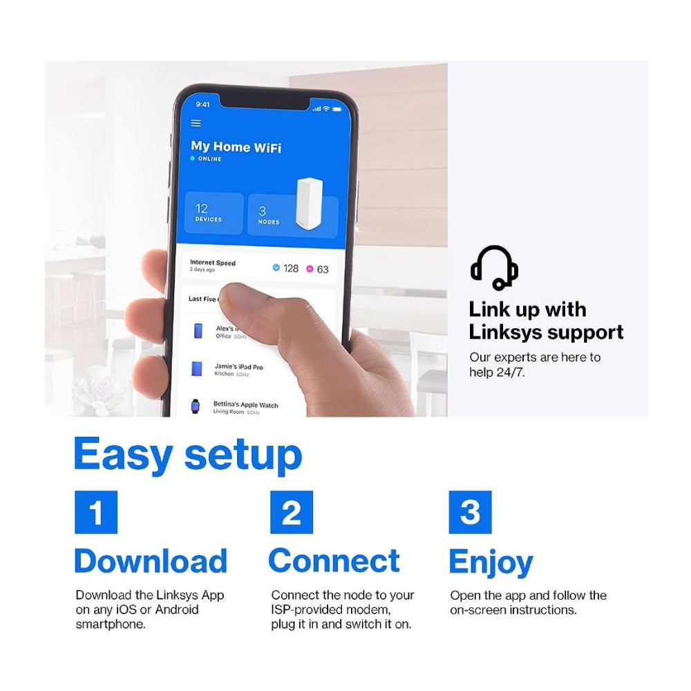 Upgrade your home network with the Linksys MX12600 Mesh WiFi System, designed to deliver ultra-fast and reliable WiFi 6 performance across your entire home. Powered by advanced Tri Band technology and Intelligent Mesh, this system provides seamless coverage of up to 8,100 sq ft and supports over 120 connected devices. Enjoy smooth streaming, lag-free gaming, uninterrupted video calls, and stable connections for all your smart home devices. With a simple app-based setup, built-in security features, and customizable parental controls, the MX12600 offers powerful, whole-home WiFi that grows with your needs.