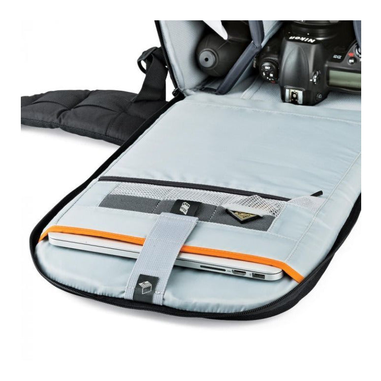 This backpack has the capacity to fit a Pro DSLR camera with 400mm lens or 500mm detached lens and also fits 1-2 extra camera bodies, 4-6 extra lenses, and flash. The CradleFit pocket suspends and protects 15-inch laptop and 10-inch tablet. It also has a hideaway tripod mount that secures a compact tripod to the pack. Additionally, it has a front storage panel and removable, padded accessory pouch.