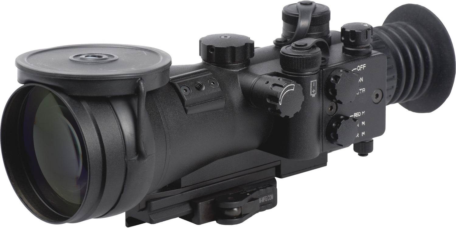 The illuminated Mil-Dot reticle color can be changed from red to orange to green for better aim in the variety of visual conditions and the reticle illumination can be adjusted smoothly via separate wheel. Variable gain control allows user to control the image brightness according to the ambient conditions. Scope comes with two Moisture-Control Cartridges (one installed and one spare) allowing the unit to absorb moisture resulted from operation at high humidity levels. The distance focusing wheel is on top of the unit to eliminate excessive shaking of the scope while focusing on the target. Scope’s variable power supply allows operation on either 1x3V Lithium battery or on just 1xAA type battery ensuring you would never run out of battery power. Operating light indicator turns from green to red when the battery is low. Unit comes standard with American Defense modular base mount featuring patented QD Auto Lock lever system.