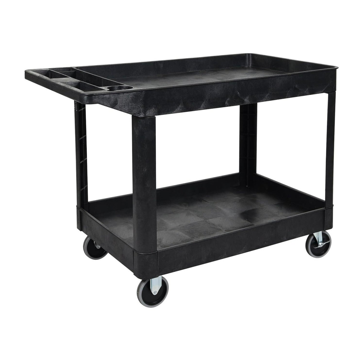 The Luxor XLC11-B Two-Shelf Heavy Duty Utility Cart in Black is a sturdy cart made of high-density polyethylene (HDPE), known for its incredible strength-to-density ratio, that enables this cart to hold and transfer loads up to 500 lbs. HDPE is a highly flexible, resilient material with heat resistance up to temperatures of 180 degrees, making this an unyielding utility cart that is built to last. The 2.5-inch deep tub shelves keep items secure. Both lightweight and sturdy, this rolling utility cart is ideal for restaurants, garages, offices or anywhere requiring durability and strength. It is constructed of an injection-molded thermoplastic resin that will not stain, scratch, dent, or rust. The 2.5-inch-deep tub shelves keep items secure. Its legs are constructed as corner pieces rather than hollow legs to create maximum shelf space. The cart comes with 5-inch heavy-duty casters and 5-inch semi-pneumatic casters, each with two locking brakes. Made in the USA, this product meets ANSI and BIFMA standards.