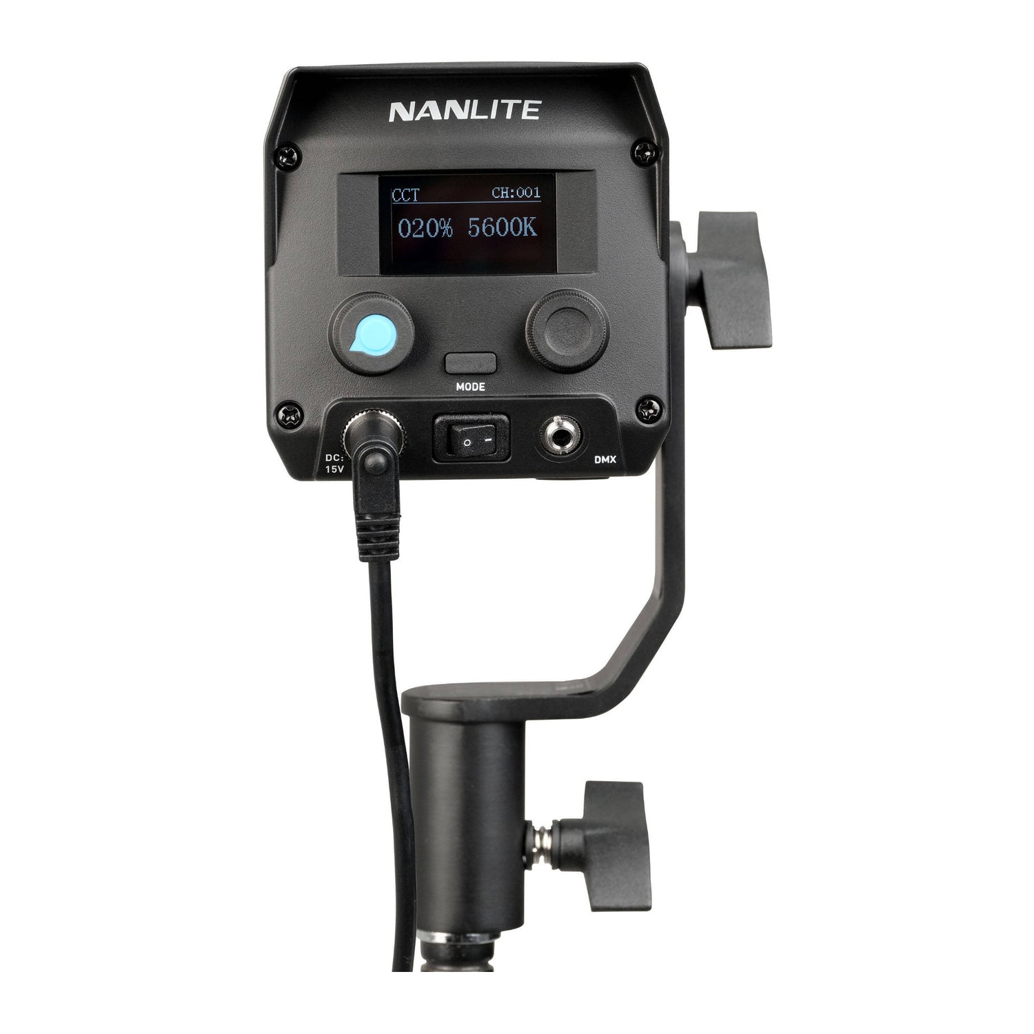 Local adjustments are made through the 1.3-inch OLED display, mode button, and dual knobs. The light can also be controlled remotely via Bluetooth using the NANLINK app, DMX/RDM through a locking metal port with an optional adapter cable, or 2.4 GHz remote operation using optional handheld or transmitter units.