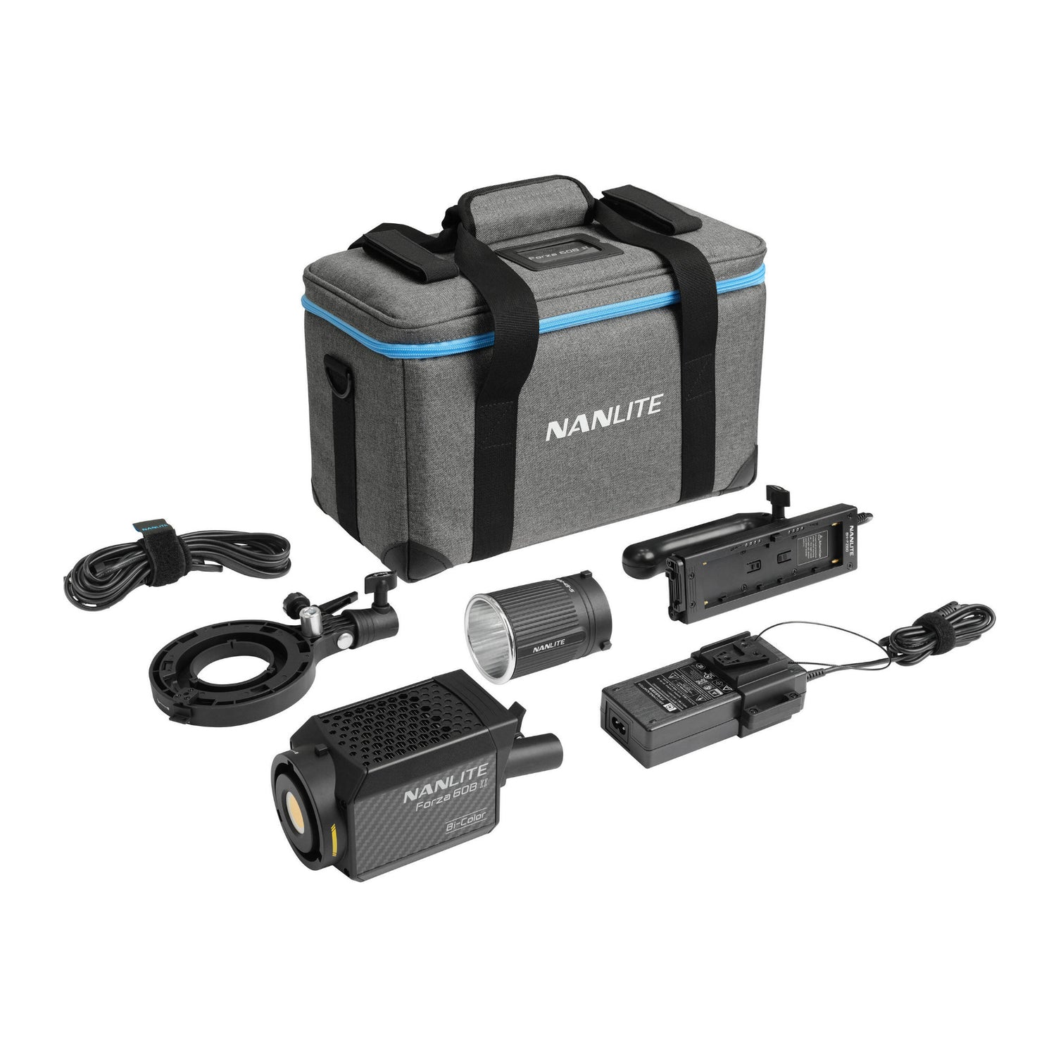 The Forza 60B II supports AC power from 110 to 240 volts and can also run on NP-F or V-mount batteries for use in locations without AC power. It can operate up to 90 minutes at full brightness using two NP-F970 batteries with the included handgrip, or up to 120 minutes with a 14.8V 160WH V-mount battery, with a V-mount handgrip sold separately.