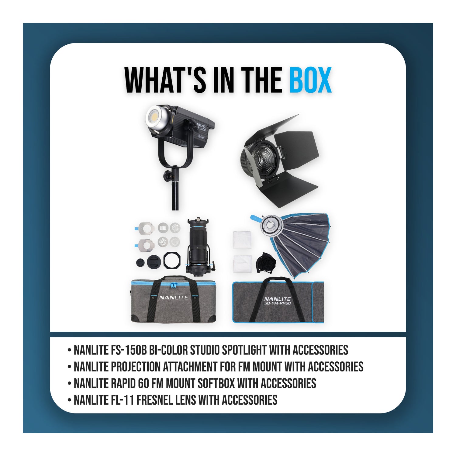 Nanlite FS-150B Bundle with Projection Attachment, Softbox, and Fresnel Lens