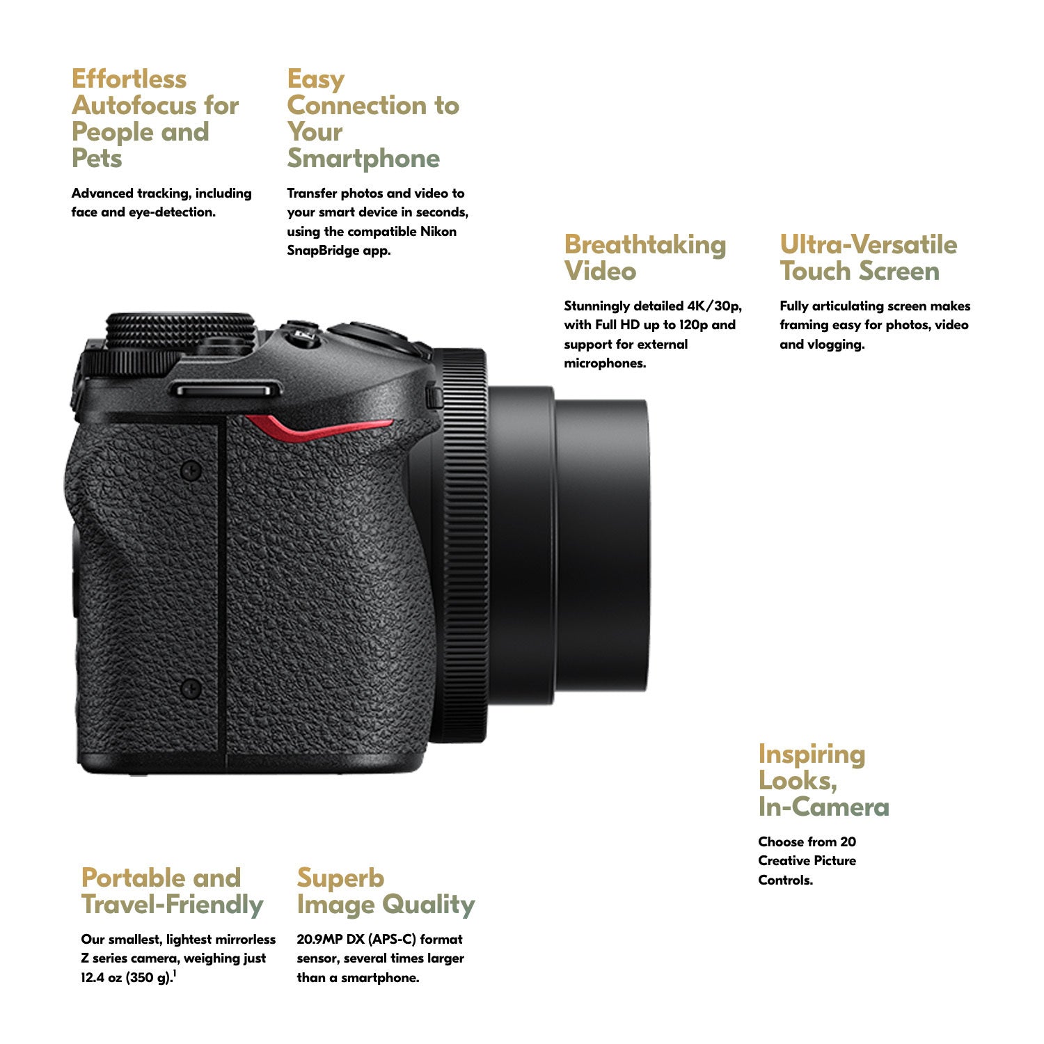 Creators, meet the camera you’ve been looking for. The Z 30 is packed with the features you need, like a front-facing screen, crisp 4K video, crystal-clear audio and worry-free autofocus. Designed to inspire your best work with easy operation, smart connectivity and convenience.