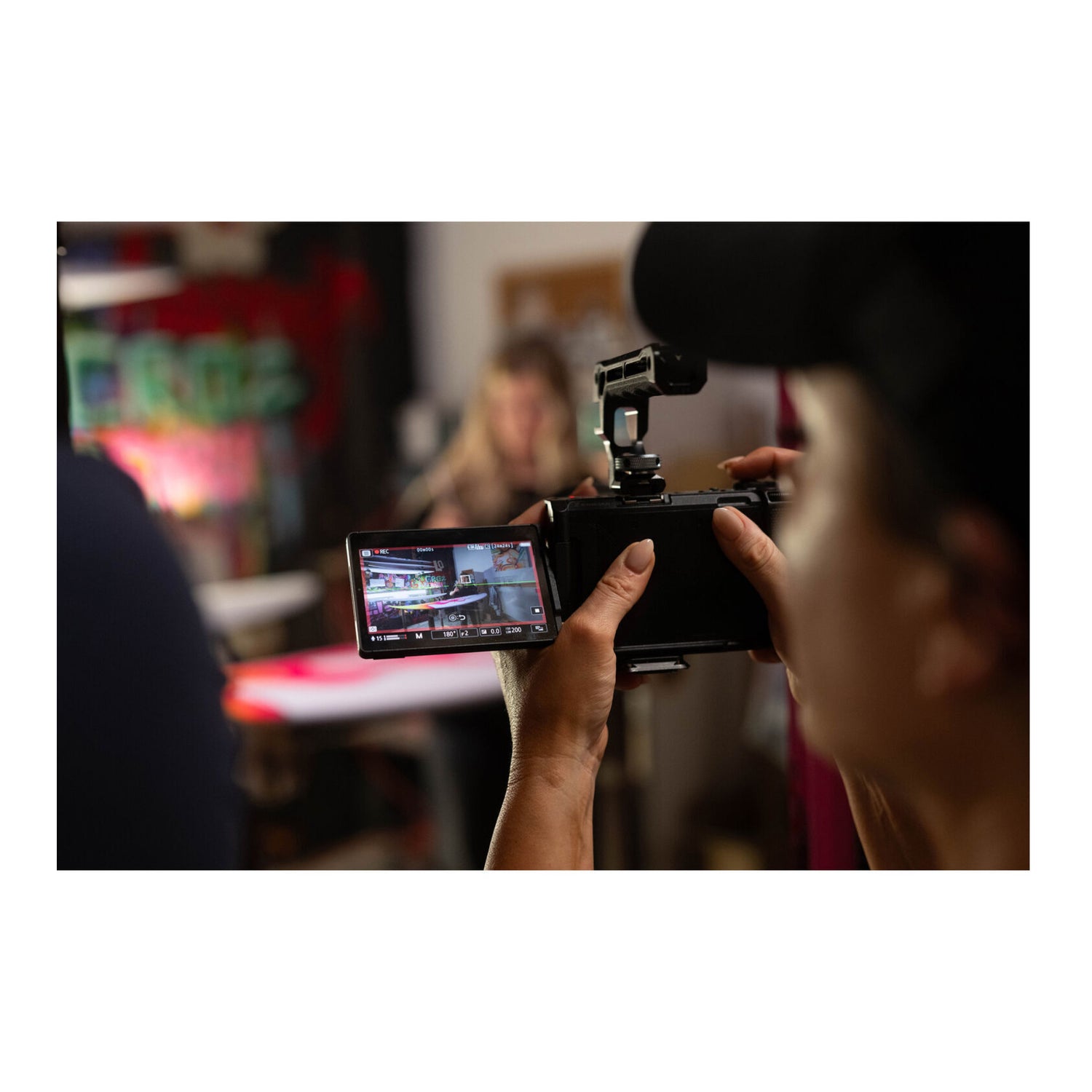 In-body stabilization up to 7.5 stops with any lens. Dual-base ISO at 800/6400 for Log3G10 and N-Log profiles. Shutter angle adjustable from 5.6° to 360°.