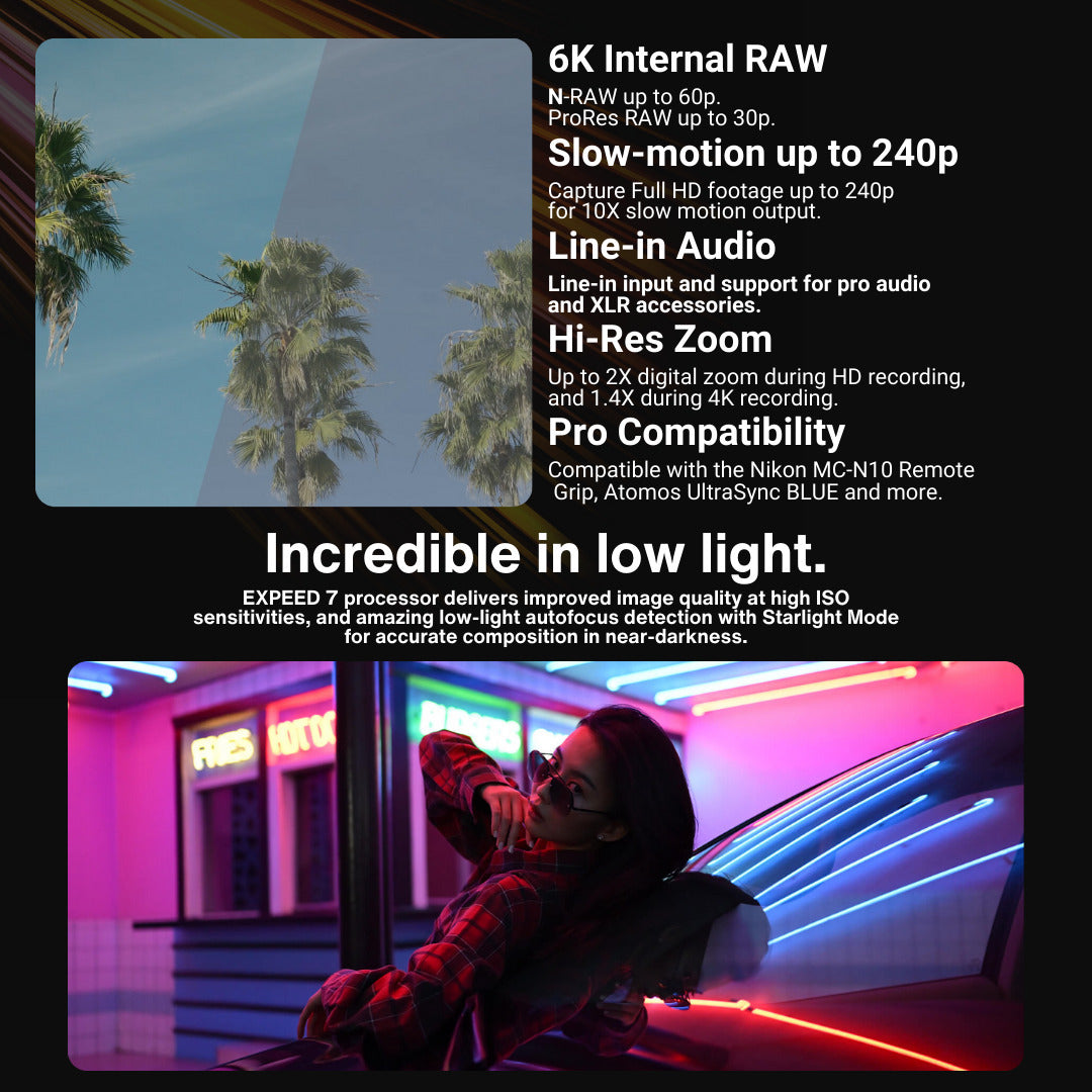 | Compatibility | Z-mount lenses; F-mount via adapter (restrictions apply) |