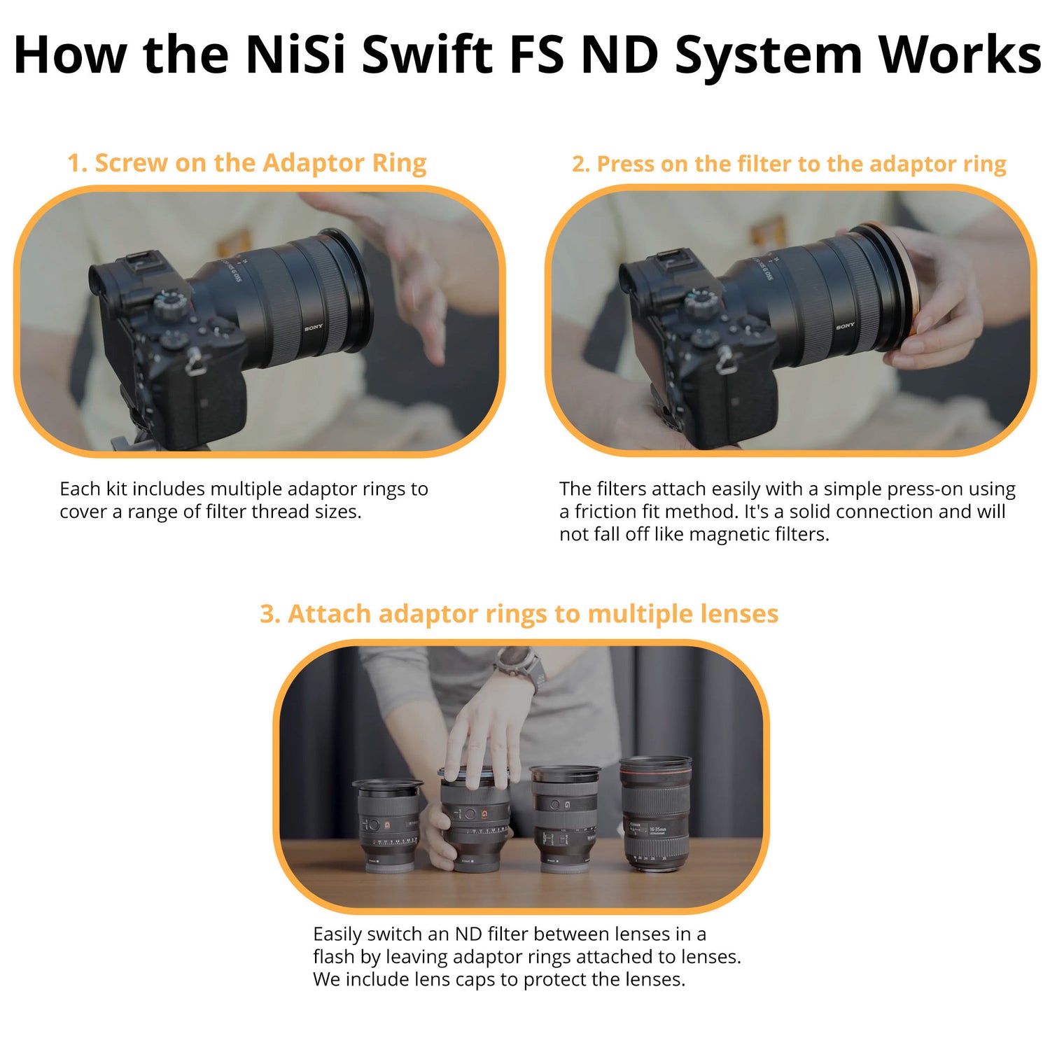 Innovative Swift System: The Swift system redefines conenience in filter usage. Effortlessly press the filters onto the front of the adaptor rings for quick changes or stacking. This feature is ideal for photographers who need to adapt quickly to changing light conditions without missing a beat.