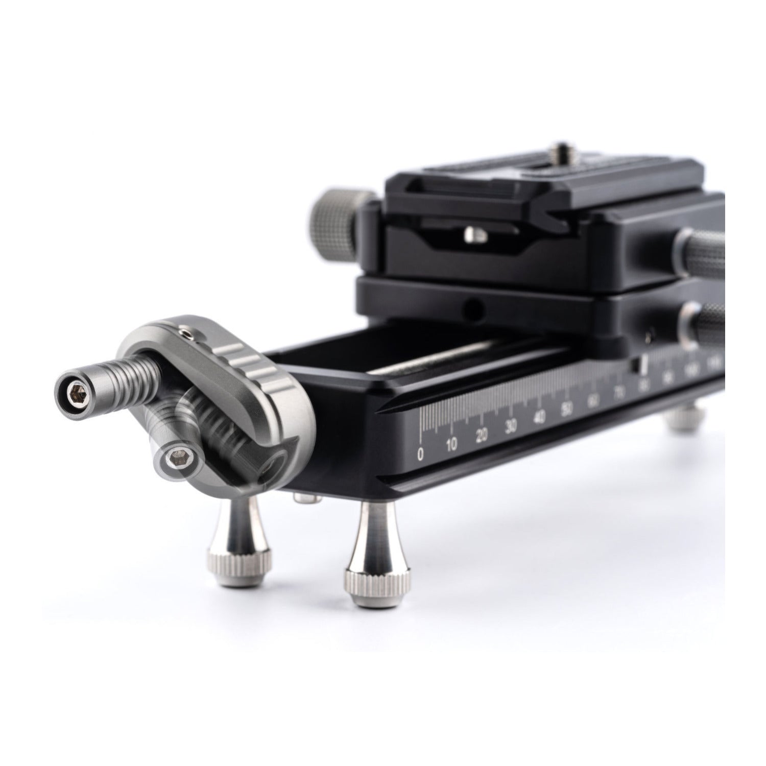 The Macro Rail can be mounted in most Arca-type clamps/ball heads on the market and also includes four detachable foot nails that allow the use of the rail directly on the tabletop. The stage travel per revolution is 1.25mm with engraved index marks on both sides of the rail for fine adjustments. The bottom for the rail includes a 3/8-inch and 1/4-inch screw hole which allows the use of all tripod heads.