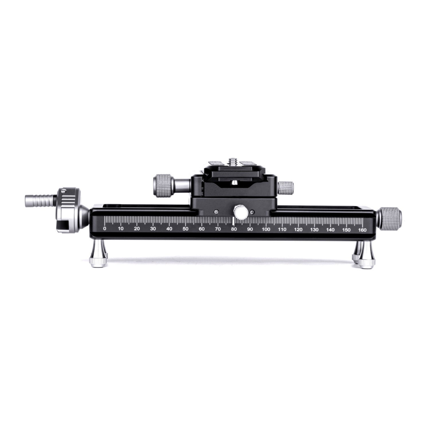 The NiSi Macro Focusing Rail NM-180 with 360 Degree Rotating Clamp gives you the ability to precisely adjust the position of your camera when shooting macro photography. The rail is equipped with an integrated Arca-type compatible quick release clamp and also includes an Arca-type plate. The focusing rail itself has a double-dovetail mount and will fit most Arca-type clamps on the market. The mounting clamp allows 360-degree rotation to change the camera direction without having to remove the plate from the clamp. The adjustment range is 160mm while the clamp size is 180mm, maximizing the movement of the camera. The movement is adjusted by a Collapsible Thumb-Screw Knob which makes it easy to adjust and store. Included is a longer quick-release plate designed for telephoto lenses and with a groove for straps and is easy to lock and release. The maximum load of the rail is 5kg.