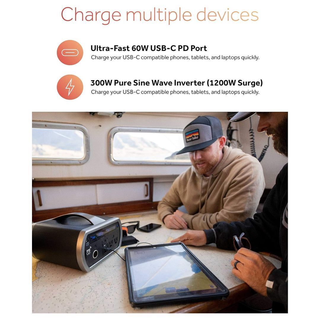 This power station features two AC outlets (110V, 300W, 1200W Peak), two USB-A ports, two USB C ports, and a carport. Its Battery Management System governs each cell, improving the battery life cycle while being pass-through charged.