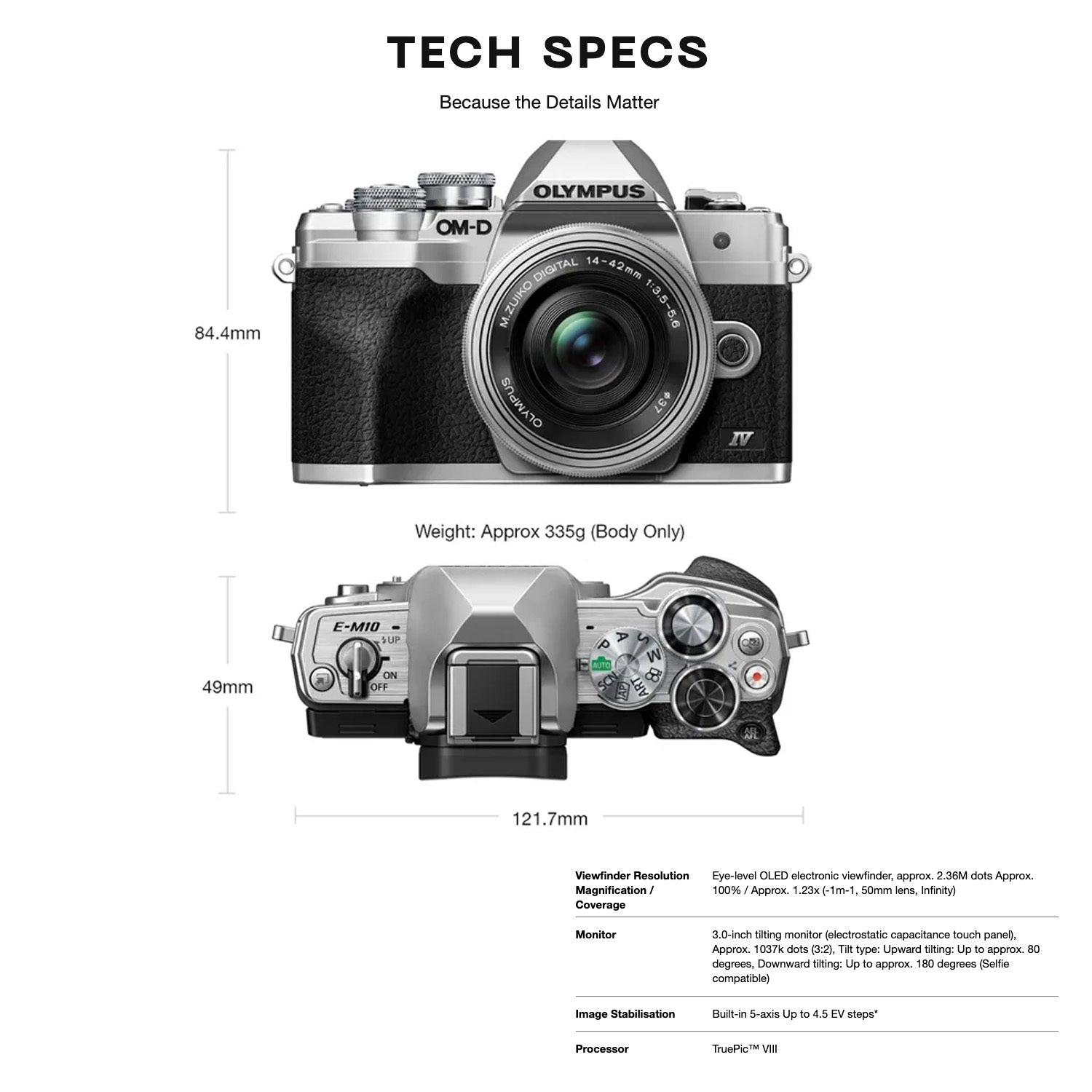 - Stabilization performance: 4.5 EV steps (when using the M.ZUIKO DIGITAL ED 14-42mm f/3.5-5.6 EZ)