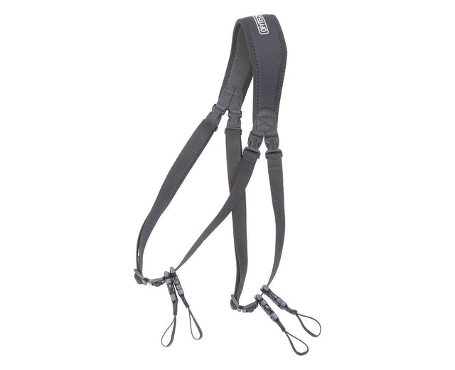 The Utility Sling - Duo offers quick access to two pieces of gear while maintaining the security of a strap worn across a single shoulder. The Utility Sling - Duo comes with four of OP/TECH USA's exclusive Uni-Loop Connectors. Gear hangs securely at the sides and will glide up and down the sling without interfering with a camera's tripod mount connection. Most cameras will only need one Uni-Loop Connector, but for cameras with a third strap-connection point located on the battery grip, the second Uni-Loop Connector (included) will be used. As the pad of the strap combines neoprene and elastic at its core, it absorbs the shock of your movements. The patented weight reduction system in the Utility Sling - Duo makes gear feel 50 percent lighter lighter and 100 percent more comfortable!