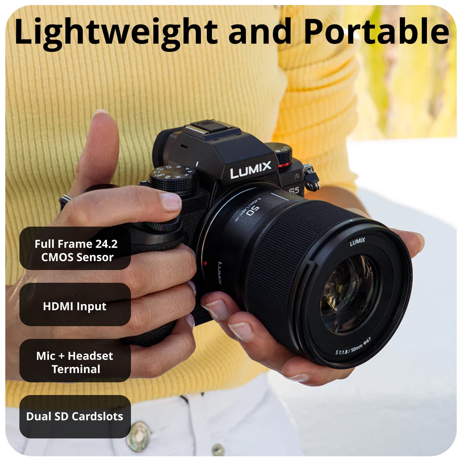 The Panasonic LUMIX S5 is a high-quality, high-performance hybrid full-frame mirrorless camera designed especially for content creators, helping you bring your ideas forward in breathtaking clarity and color. Still photos and video come alive using the latest advances in image resolution, image stabilization, and autofocus, all in the lightweight, compact, durable body that is the signature of LUMIX.