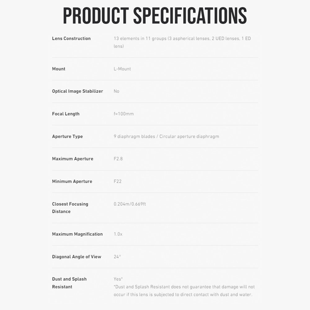 • Panasonic Lumix S-E100 Full Frame 100mm F2.8 Macro Lens for Lumix S Series Cameras