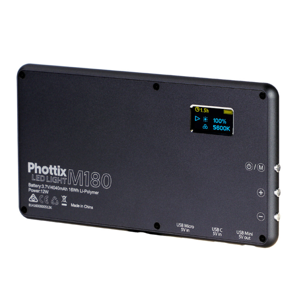 The Phottix M180 LED Light is also a power bank. Devices can be charged via a Mini USB from the 4040 mAh, 3.85V battery. The M180 can be charged with USB-C or USB Micro cables. Never be caught without power or light! Whether shooting weddings, interviews, portraits, videos, macro shots with a phone or camera, the Phottix M180 LED Light is a perfect companion for smart phone users and on-the-go content creators.
