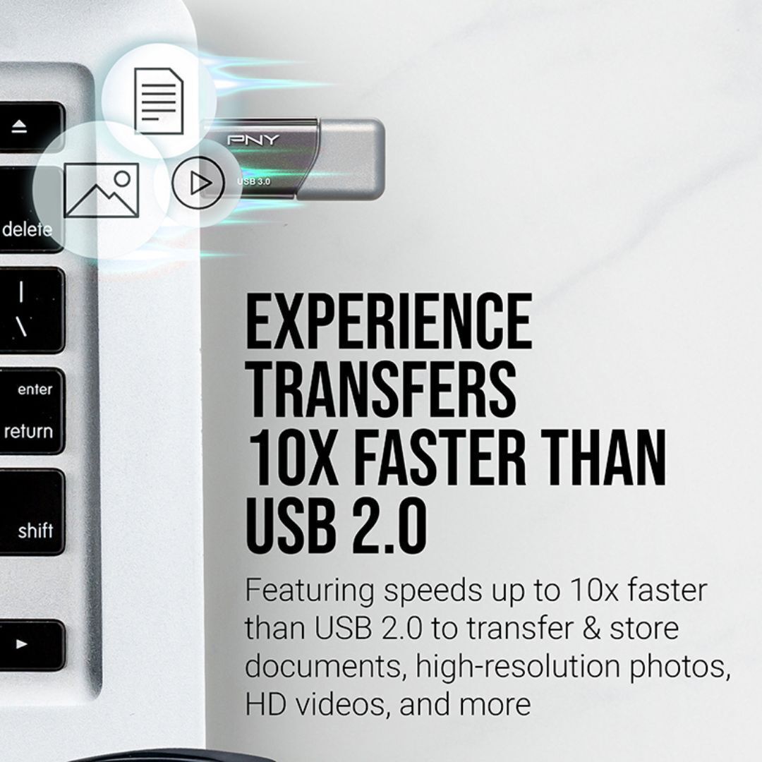 PNY’s Turbo Attache 3 USB 3.0 is built for speed and convenience. Experience the USB 3.0 next generation speed performance with transfer speeds up to 10 times faster than USB 2.0. It's the perfect solution for easily storing and quickly transferring all your large documents, high-resolution photos, HD videos, and more. These flash drives are available in a pack of 2 with each drive having 128GB storage capacity.