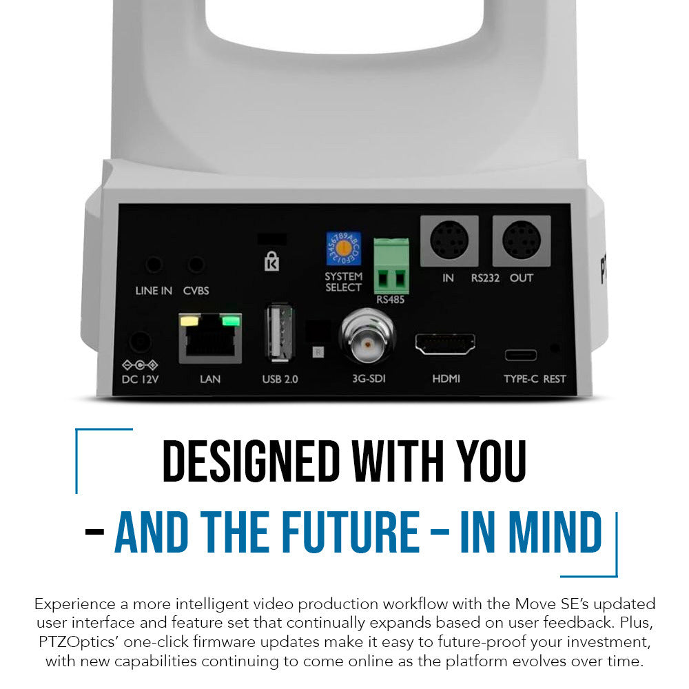 The PTZOptics Move SE is ideal for multi-camera productions and large-scale deployments. Experience a more intelligent video production workflow with Move SE’s updated user interface and feature set that continually expands based on user feedback. Plus, PTZOptics’ one-click firmware updates make it easy to future-proof your investment, with new capabilities continuing to come online as the platform evolves. With 30x optical zoom options, plus PoE, the Move SE can fit seamlessly into any production scenario.