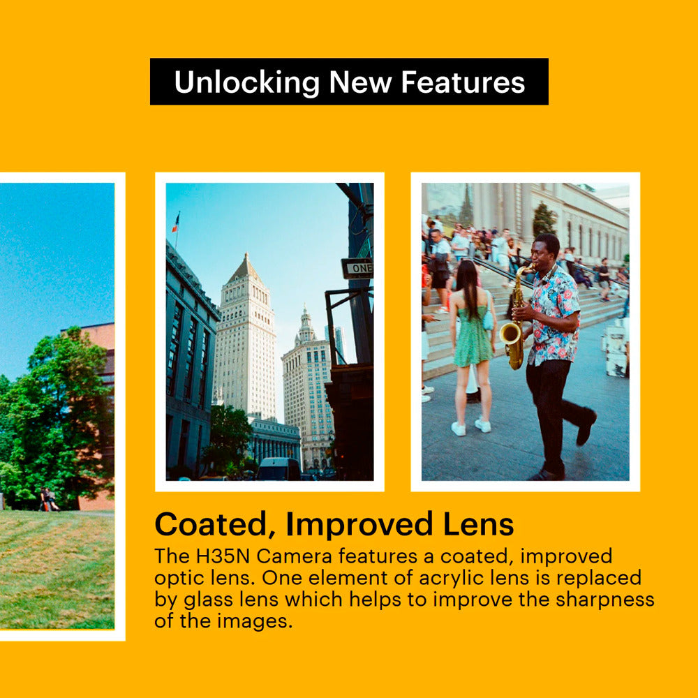 The Kodak Ektar H35N 35mm Half Frame Film Camera is an advanced version of the H35 Camera. This new release possesses three new highlights that are rarely found on other reusable film cameras. With these new advancements and features, creating artsy images with the camera is trouble-free. This camera model comes in a matte striped green design, which gives out a low-key lavish feeling. The H35N not only delivers exceptional image quality but also boasts a voguish design, making it the perfect chic accessory in the room. Other features include a built-in flash, manual wind and rewind film transport, and an ABS and aluminum construction.