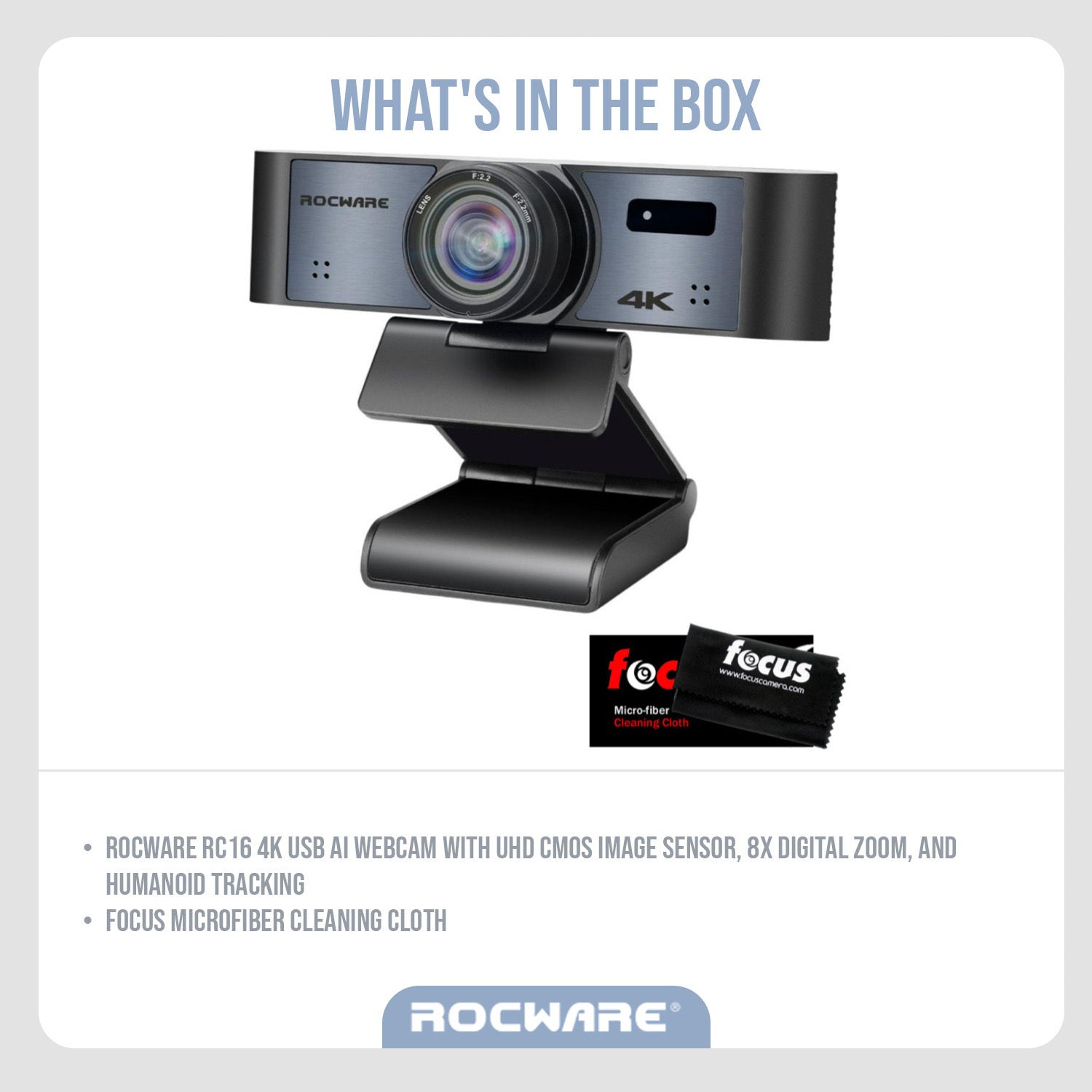 Rocware RC16 4K USB AI Webcam with UHD CMOS Image Sensor and Focus Microfiber Cleaning Cloth Bundle