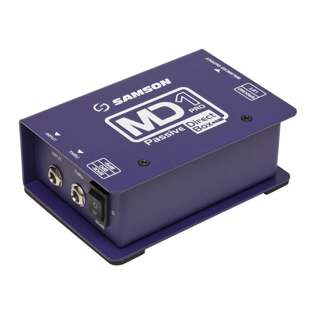 The Samson SAMD1PRO is a rugged, single-channel passive direct box designed to deliver clean, high-quality audio signals for both live performances and studio recording. It's all-metal construction protects against physical damage, while the Mu-Metal shielded STLX transformer ensures natural instrument tone with minimal interference. Featuring selectable attenuation pads and a ground lift switch, the SAMD1PRO adapts easily to different signal levels and eliminates unwanted noise. With versatile input, through, and balanced XLR output connections and no power needed, it’s a reliable, easy-to-use solution for connecting instruments to mixing consoles or recording equipment.