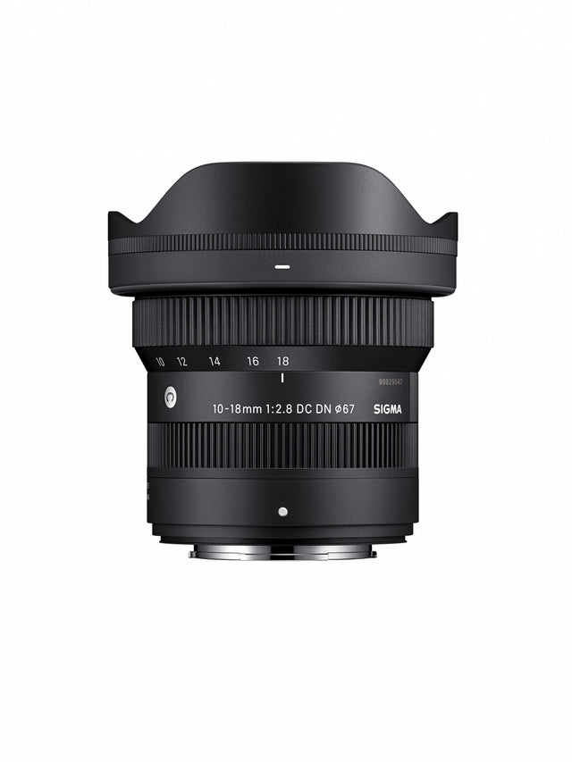 The SIGMA 10-18mm F2.8 DC DN Contemporary is the world's smallest and lightest ultra-wide-angle zoom lens for APS-C cameras at just 2.8 by 2.4 inches, and 9.2 ounces, covering an effective focal range of 15-27mm (35mm equivalent). With ultra-sharp optics, a bright F2.8 aperture, and a newly developed push-on petal type lens hood, photographers can create expressive images anytime, anywhere. It is designed exclusively for APS-C mirrorless cameras. The lens features a unique aspherical element that reduces the overall size of the lens and enhances image quality.  An 11.6 cm (1:4) minimum focusing distance produces unique compositions, with expansive backgrounds and pleasing bokeh. With a weight of only 260 grams, a fast AF stepping motor, and minimal focus breathing, the lens can be easily mounted onto a motorized gimbal to create impressive video content for social media use and professional projects.