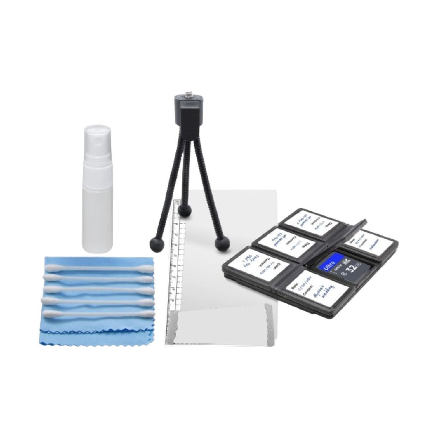 The Deluxe Starter Kit is a comprehensive accessory pack for photographers and videographers, featuring a 6-piece memory card case, mini tabletop tripod, lens cleaning solution, microfiber cloth, screen protectors, squeegee card, and cotton swabs — all designed to protect and maintain your gear while enhancing your shooting experience.