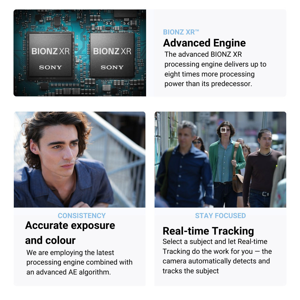 The advanced BIONZ XR processing engine delivers up to eight times more processing power than its predecessor. It minimizes processing latency while boosting movie and still image processing power, achieving natural gradations, realistic color, low noise, superior image quality and fast menu response.