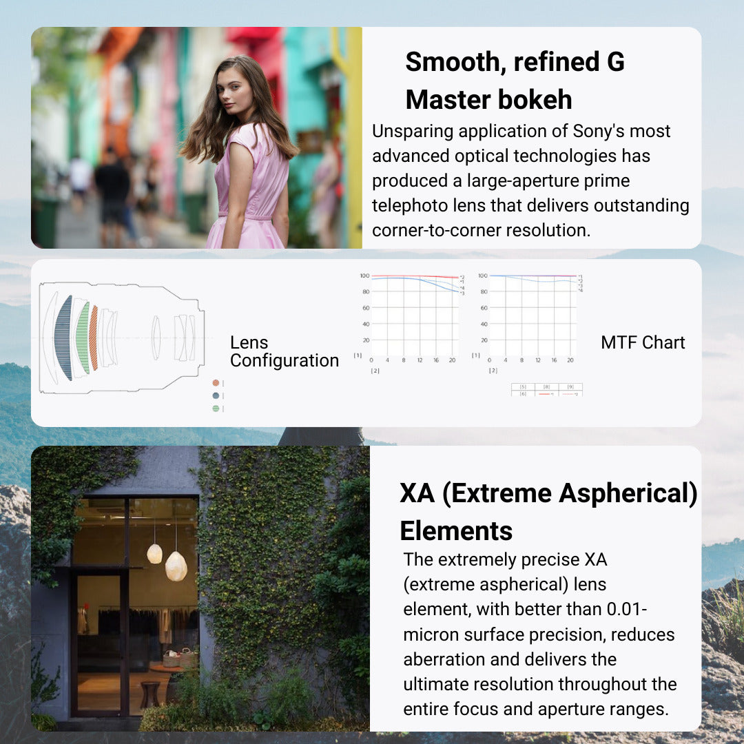 Sony FE 135mm GM is a Sony Alpha full-frame telephoto prime G Master lens. A new optical design that adheres to demanding G Master standards places XA (extreme aspherical), Super ED (extra-low dispersion), and ED glass elements in the front group to effectively suppress all common telephoto lens aberrations, while a floating focus system works with these correction measures to ensure that the highest possible resolution is maintained from center to periphery of the image edge, throughout the lens’s focus range.