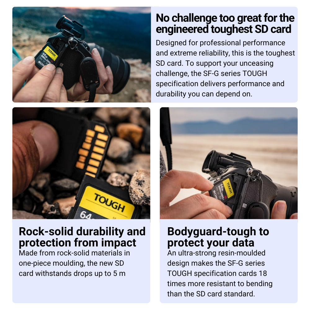 With an innovative one-piece molded design and high-durability materials, SF-M series Tough specification cards give professionals and photo enthusiasts peace of mind and protection wherever their shoots take them.