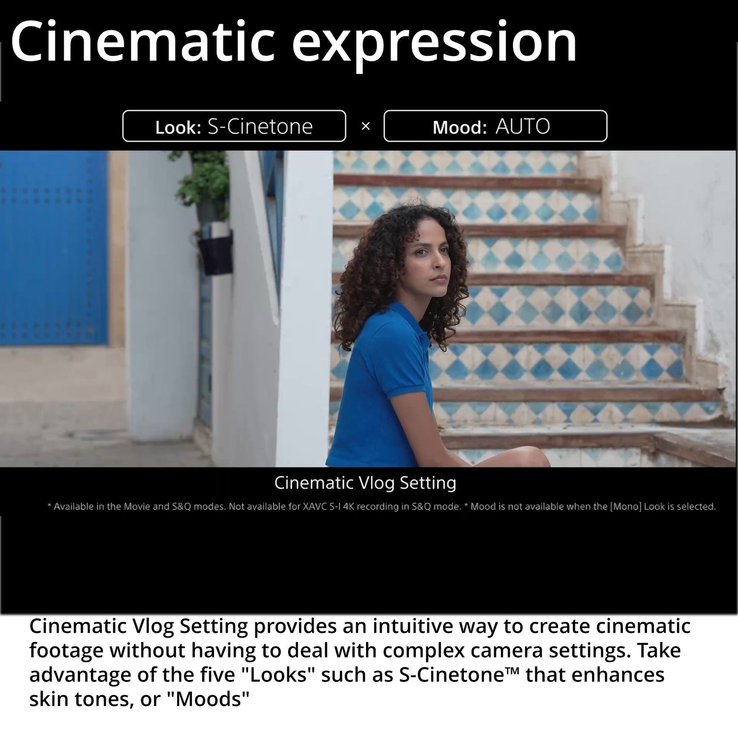 The Creative Look tool makes it simple to create expressive moods for stills and movies in-camera, with 10 presets that may be used as-is or tweaked. For even more expressive options, use the My Image Style tool. When shooting in Intelligent Auto or Scene Selection mode, users can simply modify the background bokeh, brightness, and color tone using touch screen icons. Cinematic Setting offers an easy way to generate cinematic footage without the need for complex camera settings. Use the five 'Looks', such as S-Cinetone, which improves skin tones, and 'Moods,' which accentuate specific colors, to create cinematic film that matches the scene and your vision.All-New Autofocus