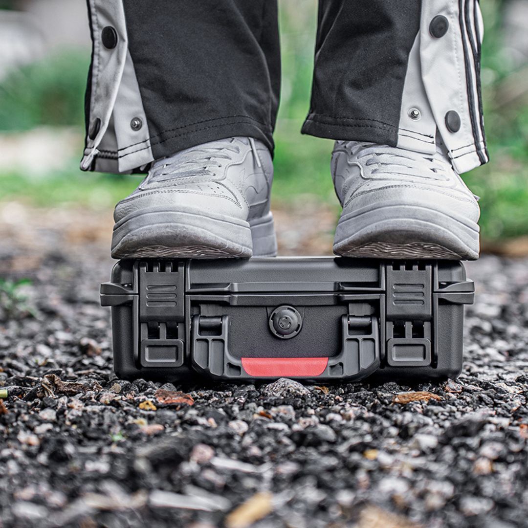 The STARTRC Waterproof Hard Case in Black is designed for DJI Osmo Pocket 3 camera and accessories. It fits an Osmo Pocket 3, a Type-C to Type-C PD cable, an Osmo Pocket 3 protective cover, a wrist strap, a Osmo Pocket 3 handle with 1/4-inch thread, an Osmo Pocket 3 wide-angle lens, one Mic two transmitter, one Mic 2 windscreen, one Mic 2 clip magnet, an Osmo Pocket 3 battery handle, an Osmo Mini Tripod, and other Pocket accessories. It has internal filled elastic sponge inserts with abrasion and an impact-proof outer shell. This Pocket 3 protective case is anti-impact, anti-scratch, waterproof, and dustproof. Waterproof action camera cases can protect your Pocket 3 combo in harsh environmental conditions. It is ideal for outdoor adventures. The portable soft grip handle makes it effortless and safe to carry the DJI Pocket 3 and accessories for outdoor activities and is ideal for traveling or home storage. The box body is made of masonry pattern PP material panels so that the box can resist the impact of general objects and is not easy to deform, anti-drop and smash-proof, has strong load-bearing capacity, and effectively protects the safety of equipment. It uses high-quality EVA material for precision machining to ensure precise fit and protect equipment. The case offers high-efficiency waterproof, high-density lock, tight sealing outdoor aerial photography, and no fear of pouring rain. It has a handheld handle with strong load-bearing capacity to relieve hand pressure. The new automatic balancing valve is fearless of altitude and the difference in internal and external air pressure caused by temperature avoids the phenomenon of being unable to open or collapse.