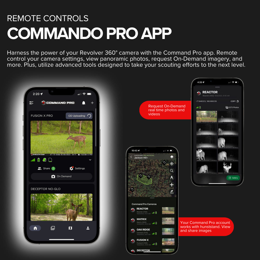 The all new Stealth Cam Revolver 36MP 360-Degree Cellular Trail Camera delivers the equivalent of six cameras worth of coverage in a single device capturing 4MP, 8MP, 16MP, and 36MP photos and 1080 HD video with audio via a revolutionary, 360-degree cellular model that covers six zones to deliver a complete panorama of its surroundings. This means users get a full 360 degrees of visibility, day and night, to ensure they never miss a thing even deer passing behind where the lens is positioned. Plus, thanks to its silent, pivoting motor, you can get more than just one photo from a single vantage when a zone is triggered. The camera responds quickly to deliver high-quality images and videos in real time, making it ideal for use on food plots. Choose from three photo operation settings, including: single-zone capture, 180-zone capture and 360-zone capture. Four power LEDs boast a whopping 80-foot detection range which, when paired with the 0.4-second trigger speed, burst mode and timelapse capabilities, provide reliable updates in real time, 24x7. Thanks to the integrated GPS, the camera shares its coordinates with you. Powered by a 16pc dual cartridge battery, it features a 1/4-inch threaded mount, 12V DC auxiliary jack and optional t-post mounting bracket (included). Includes Command Pro app compatibility. It comes in a pack of 6.