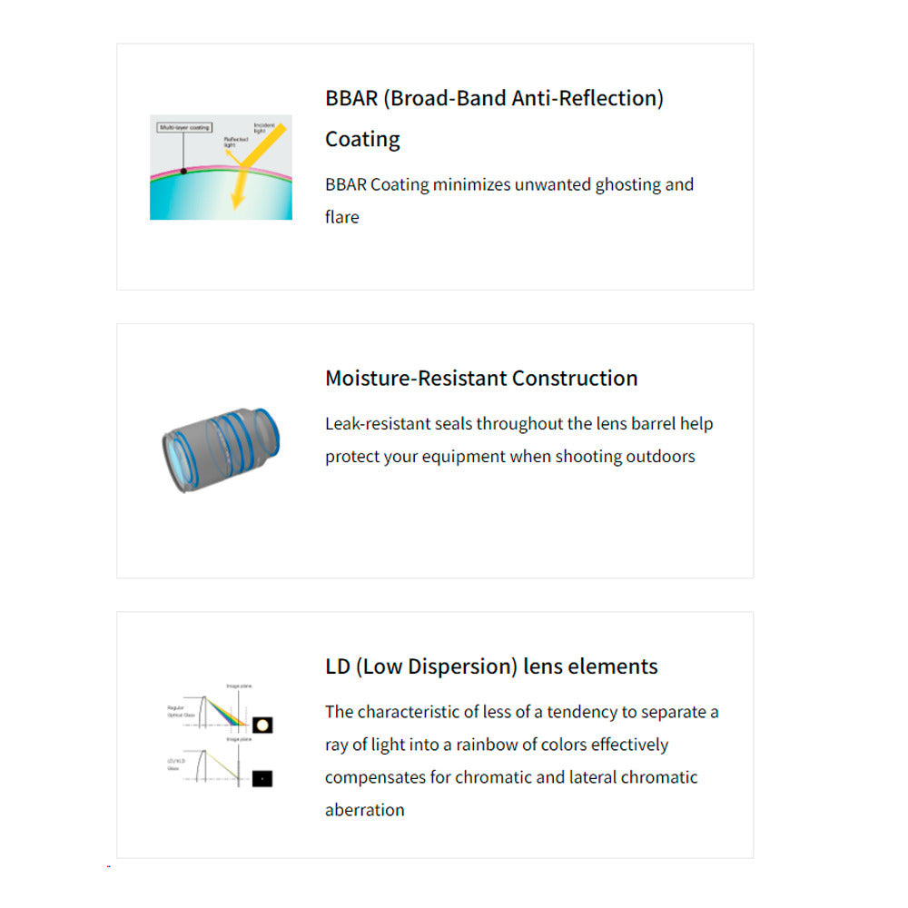The lens features two molded glass aspherical elements deliver planarity in field curvature. These elements ensure superb focusing uniformity over the entire field by compensating for spherical and chromatic aberrations.