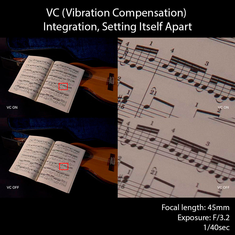The Vibration Compensation deployed on fast-aperture lenses dramatically enhances freedom of hand-held shooting under lime light or dim room light conditions by eliminating minute camera shake. In particular, cameras with high-pixel density imagers tend to pick up subtle vibrations, resulting in degradation of image quality. VC is an excellent attribute to acquire inherent high-fidelity images. 45mm is the very first lens that employs the VC functionality among the fast standard fixed focal lenses in full-frame format.