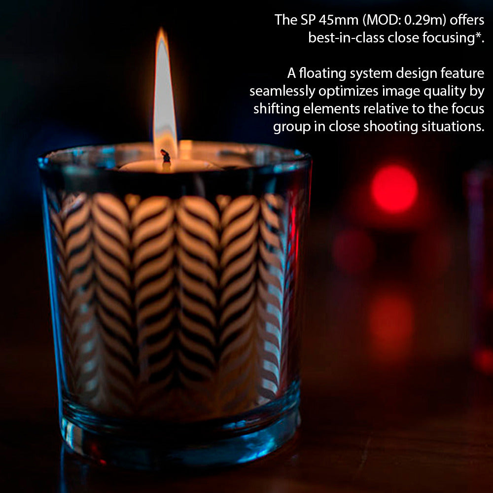 The SP 45mm (MOD: 0.29m) offers best-in-class close focusing. A floating system design feature seamlessly optimizes image quality by shifting elements relative to the focus group in close shooting situations.