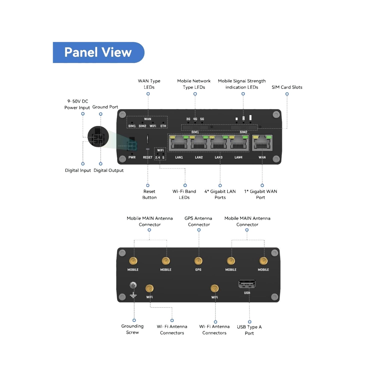 | Antenna connectors | 4 x SMA for Mobile, 2 x RP-SMA for Wi-Fi, 1 x SMA for GNSS |