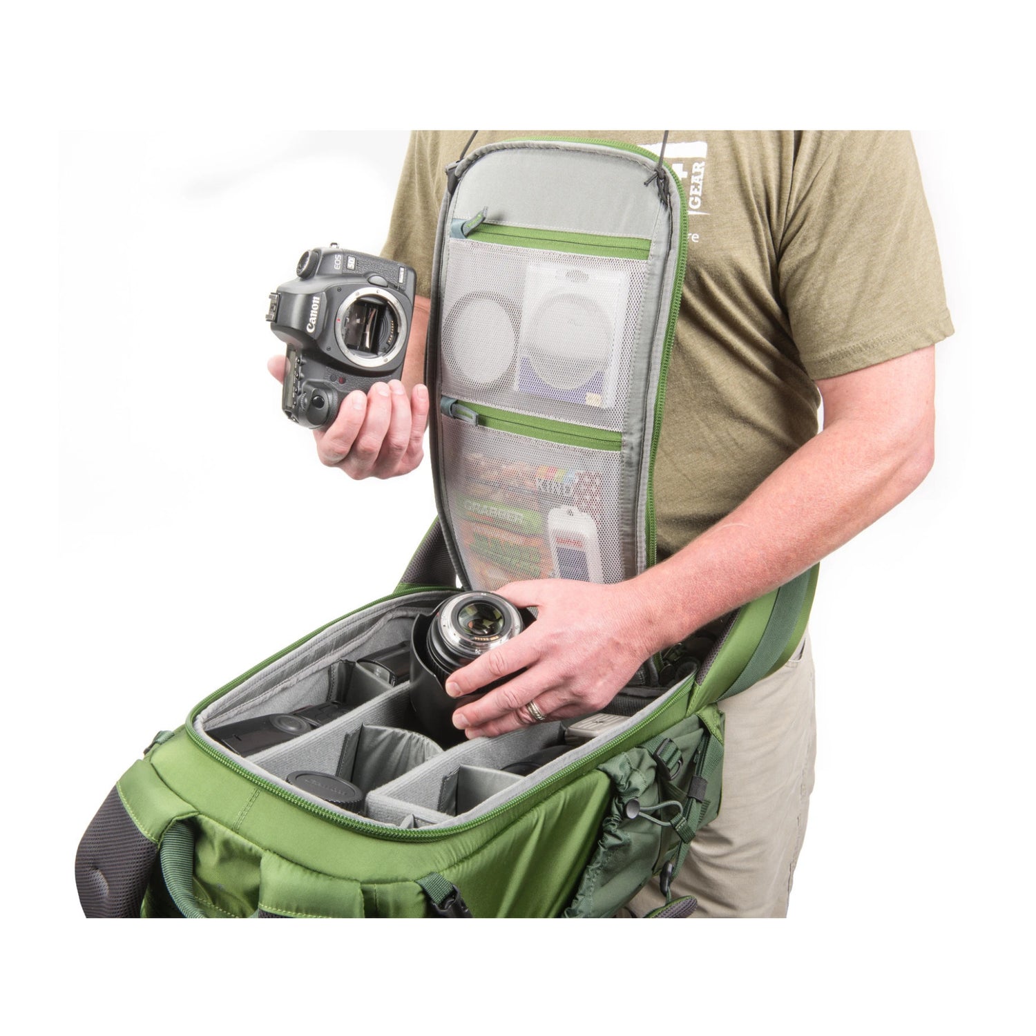 The BackLight 26L, with a rear-panel compartment for photo gear, allows you to access your gear without taking off the backpack. You can change lenses or just snap a quick photo simply by spinning the bag to the front of your body while the waist belt is still secured. The rear-panel access also adds security when traveling since your camera gear is protected behind your back. The dedicated compartments fit up to a 15-inch laptop and full-size tablet. The backpack is compatible with the tripod suspension kit, filter nest, filter hive, and switch case.