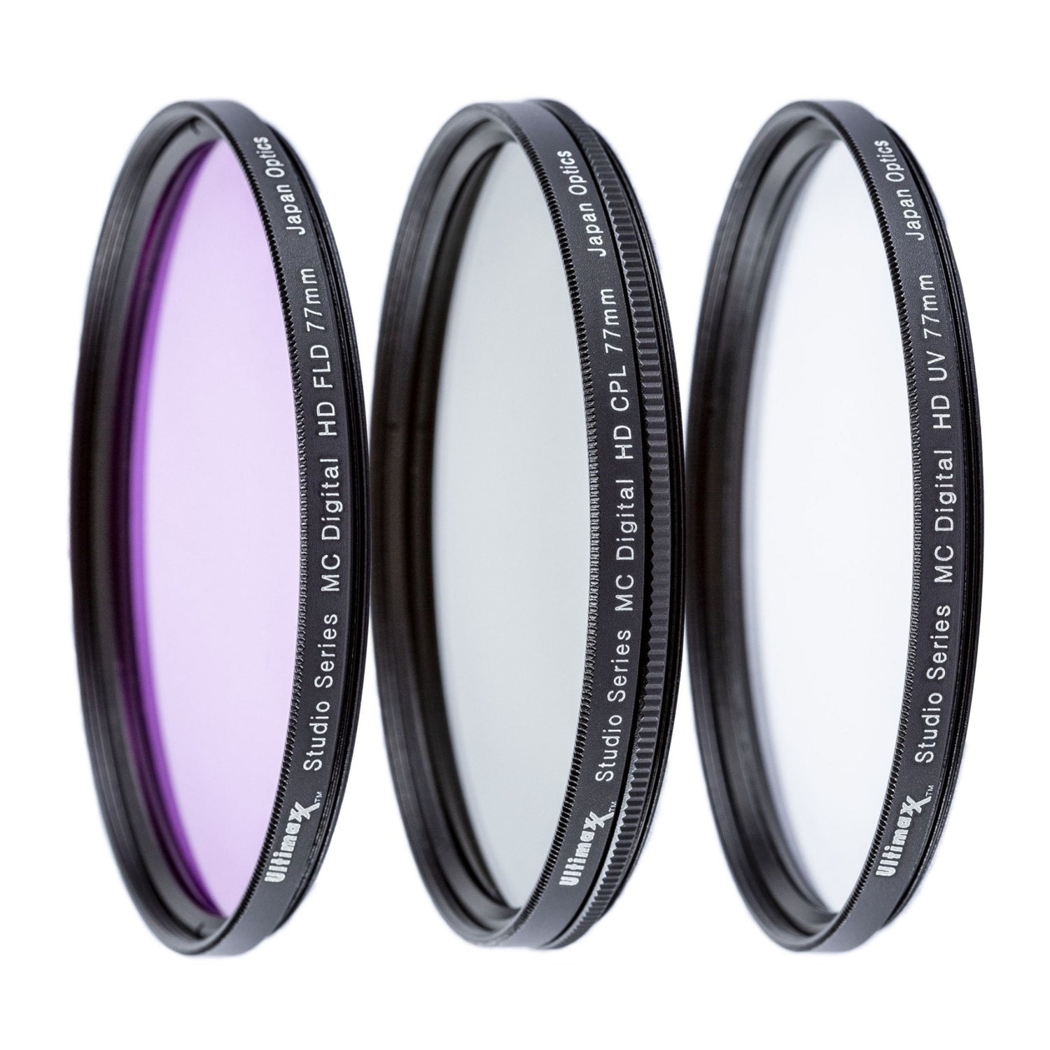 Ultimaxx 3-Piece Multi-Coated HD Professional 37mm Filter Kit includes an Ultraviolet (UV) Filter, Circular Polarizer (CPL) Filter, and Fluorescent (FL-D) Filter. It is designed for all digital and video cameras.