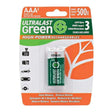 Ultralast Green High-Power Rechargeable AAA Battery lasts up to 5x longer than standard batteries per charge, making it ideal for high-power consumption devices such as digital cameras, flashes, and handheld games. With a capacity of 800mAh and 1.2V, this NiMH rechargeable battery can be used up to 500x with no memory effect. It replaces disposables in every application without sacrificing performance and is rechargeable in any NiMH charger for proper use. This battery comes in packs of 2.