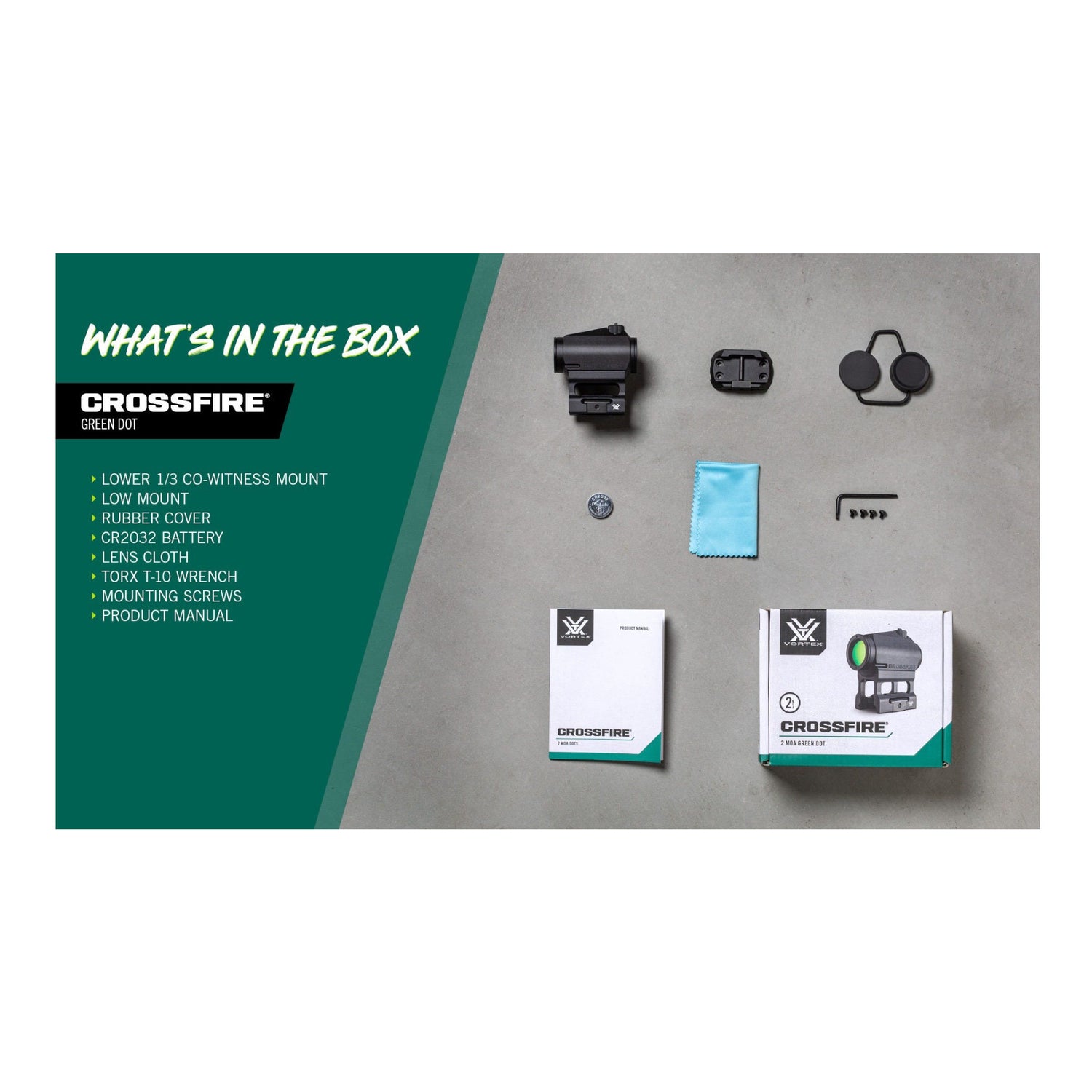 • Vortex Optics Crossfire Bright Green Dot Sight 2 MOA and Parallax-Free