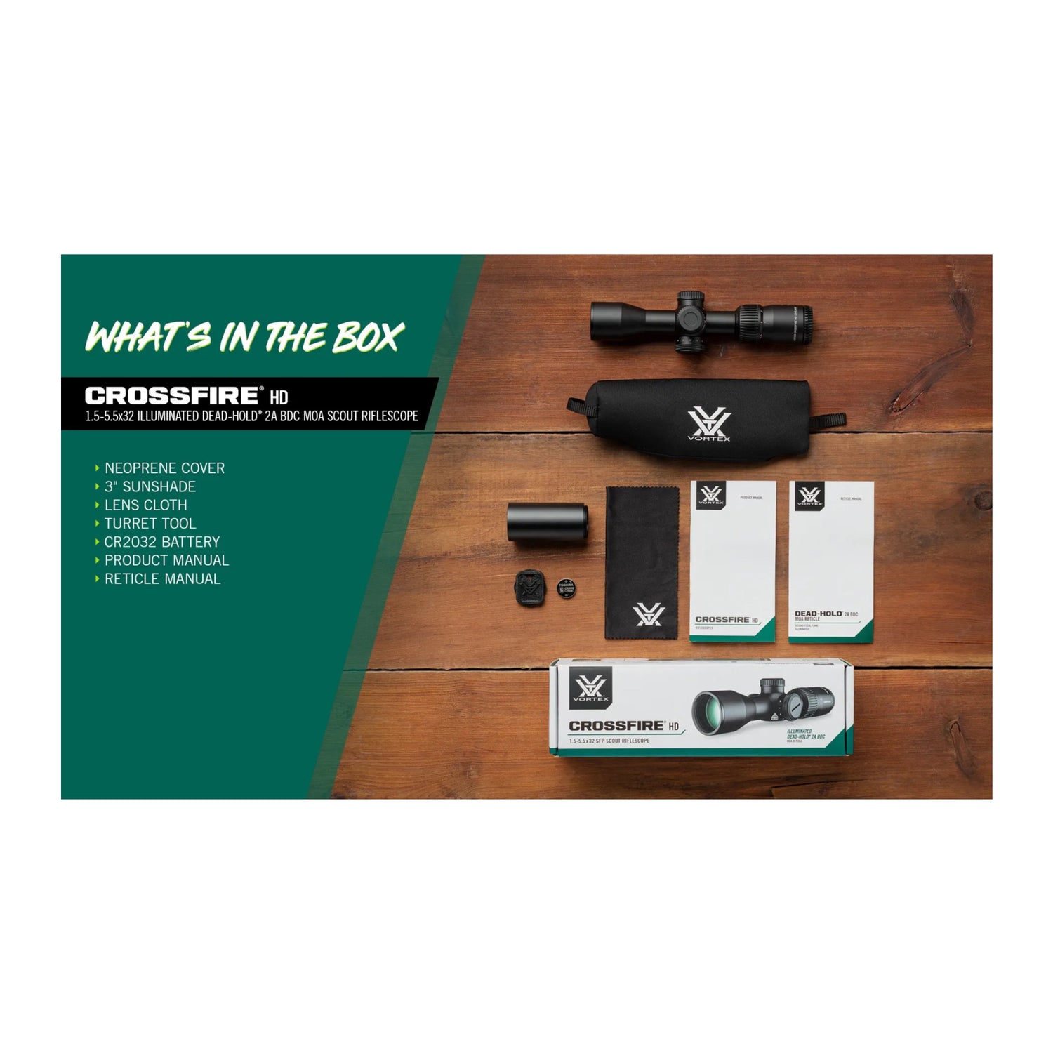 Vortex Optics Crossfire HD 1.5-5.5x32 SFP Illuminated Dead-Hold 2A BDC MOA Scout