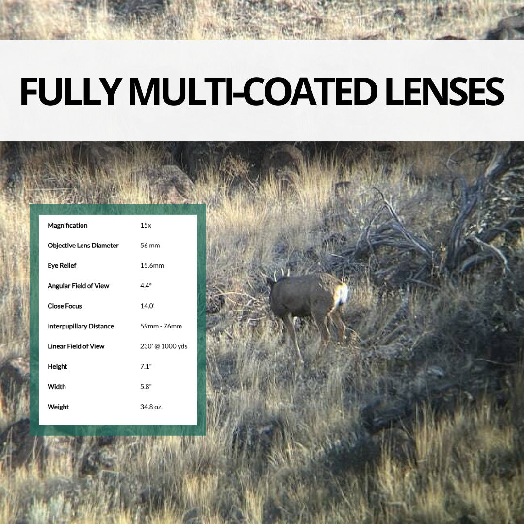 The Vortex Diamondback HD 15x56 Binoculars are packed with power and clarity. They use high-quality optics with HD clarity and up to 15x magnification. This makes the Vortex Diamondback HD a perfect pair of optics for long glassing sessions in an open country. Plus, its lightweight and durable design with magnesium alloy housing won’t weigh you down, keeping you mobile on your stalk. A rubber-armored exterior provides a non-slip grip for comfortable use.