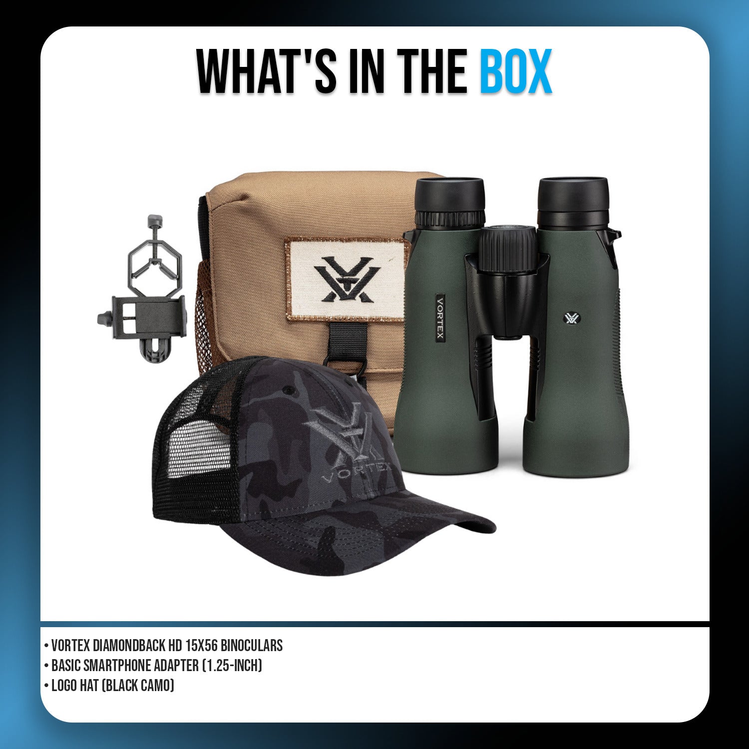 Vortex Diamondback HD 15x56 Binoculars with Basic Smartphone Adapter and Black Camo Hat Bundle