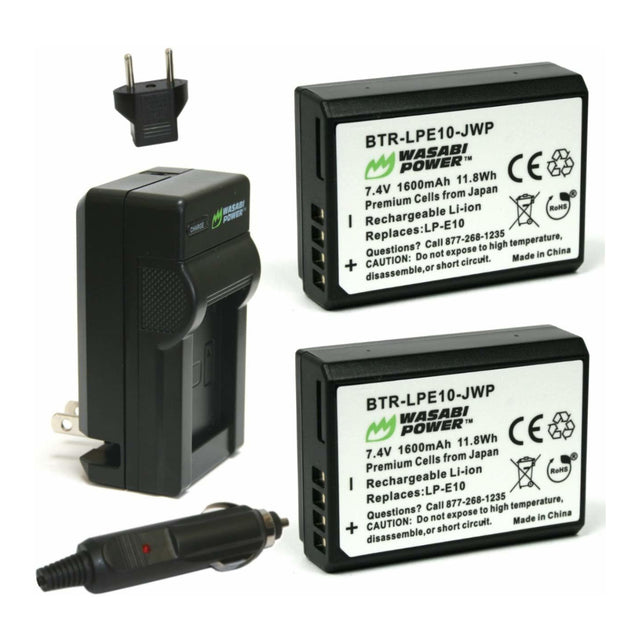 The Wasabi Battery and Charger Pack is perfectly compatible with Canon LPE10 and works as a great spare or replacement. This pack includes two Wasabi Power batteries for LP-E10 each with 7.4V, 1600 mAh power and Japanese cells and a Wasabi Power Mini Rapid A/C Charger for LP-E10 with fold-out US plug. Manufactured with premium cells for longer battery life with no memory effect, this battery charger pack includes over-charge and short-circuit protection. Additionally, it also includes European plug adapter and car adapter.