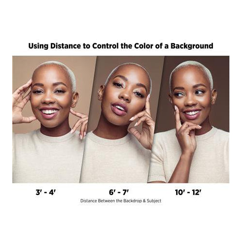 For a darker background, position the backdrop further from your subject and light source. Here, the backdrop was 3 feet, 6 feet, and 10 feet from the subject.