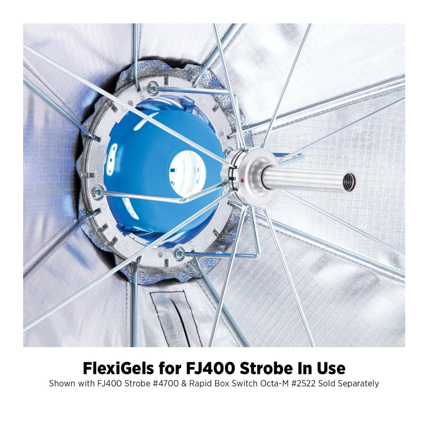 FlexiGels are the last color gels you’ll ever need to buy. They are durable, heat-resistant, and fit like a glove over the FJ400 strobe’s glass dome. Slide one of these flexible rubber gels on for endless creative lighting options. No gaffer’s tape or clips are required to hold them in place. FlexiGels are also compatible with third-party strobes that have a 2-inch height x 3.4-inch diameter glass dome and adequate ventilation hole alignment.